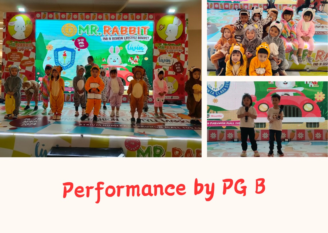Salah satu kegiatan pengembangan siswa yang kami lakukan selama tahun pelajaran ini adalah memberikan kesempatan kepada anak untuk terlibat dalam kegiatan luar sekolah. Pada tanggal 25 April 2023, anak-anak KBK Santa Clara Surabaya mengikuti kegiatan Mr. Rabbit di Pakuwon Mall, Surabaya Barat. Semua pasti penasaran ya…. apa saja sih acara yang akan dibawakan oleh anak-anak?