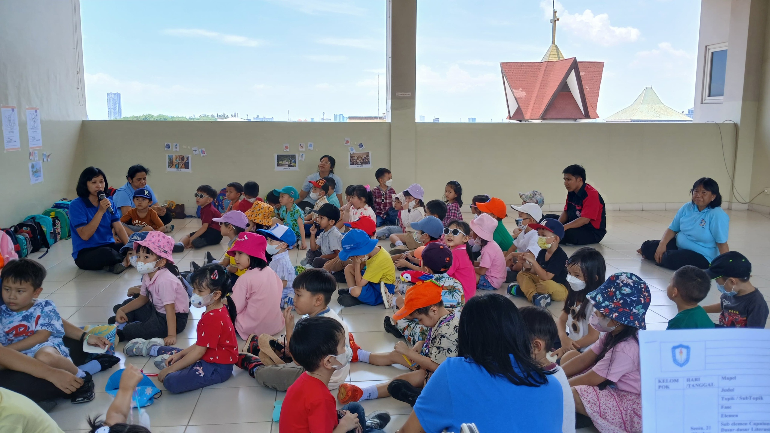 Berpakaian kasual, mengenakan topi dan kacamata hitam tentu tidak lazim jika hendak ke sekolah. Tapi itulah pemandangan yang terlihat pagi ini di TK Katolik Santa Clara, Surabaya.