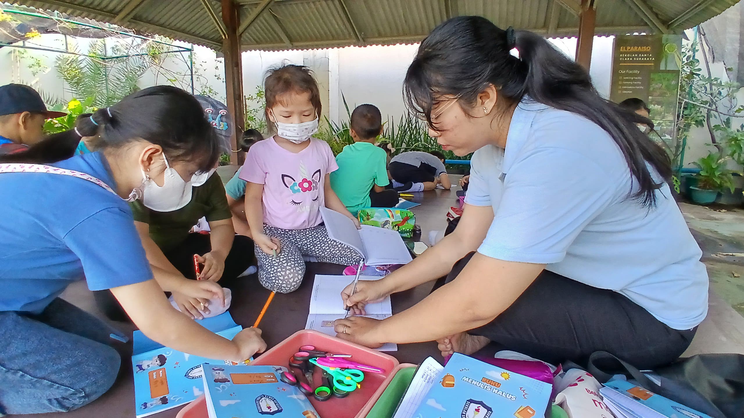 Tanpa menunggu lama, dengan gesit, semua mengambil perlengkapan yang diminta dan berangkat ke taman El Paraiso yang terletak di lantai 5 gedung SMPK Santa Clara. Hari ini adalah waktunya anak-anak rekreasi ke taman, setelah mereka belajar tentang tema tempat-tempat rekreasi.