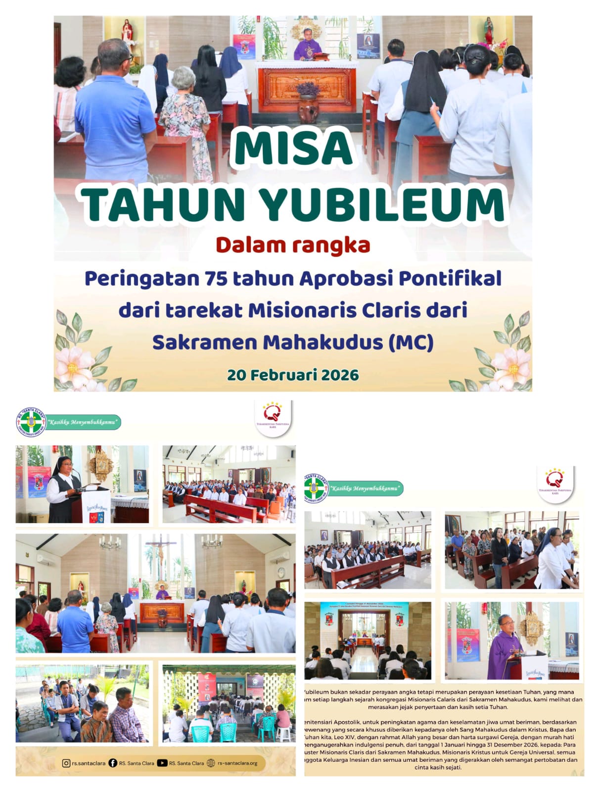 Mulai bulan Februari ini, komunitas-komunitas suster Misionaris Claris di Indonesia mengawali Tahun Yubileum Inesian ini dengan Misa Kudus. Imam dan umat menyambut dengan sukacita saat yang penuh rahmat ini.