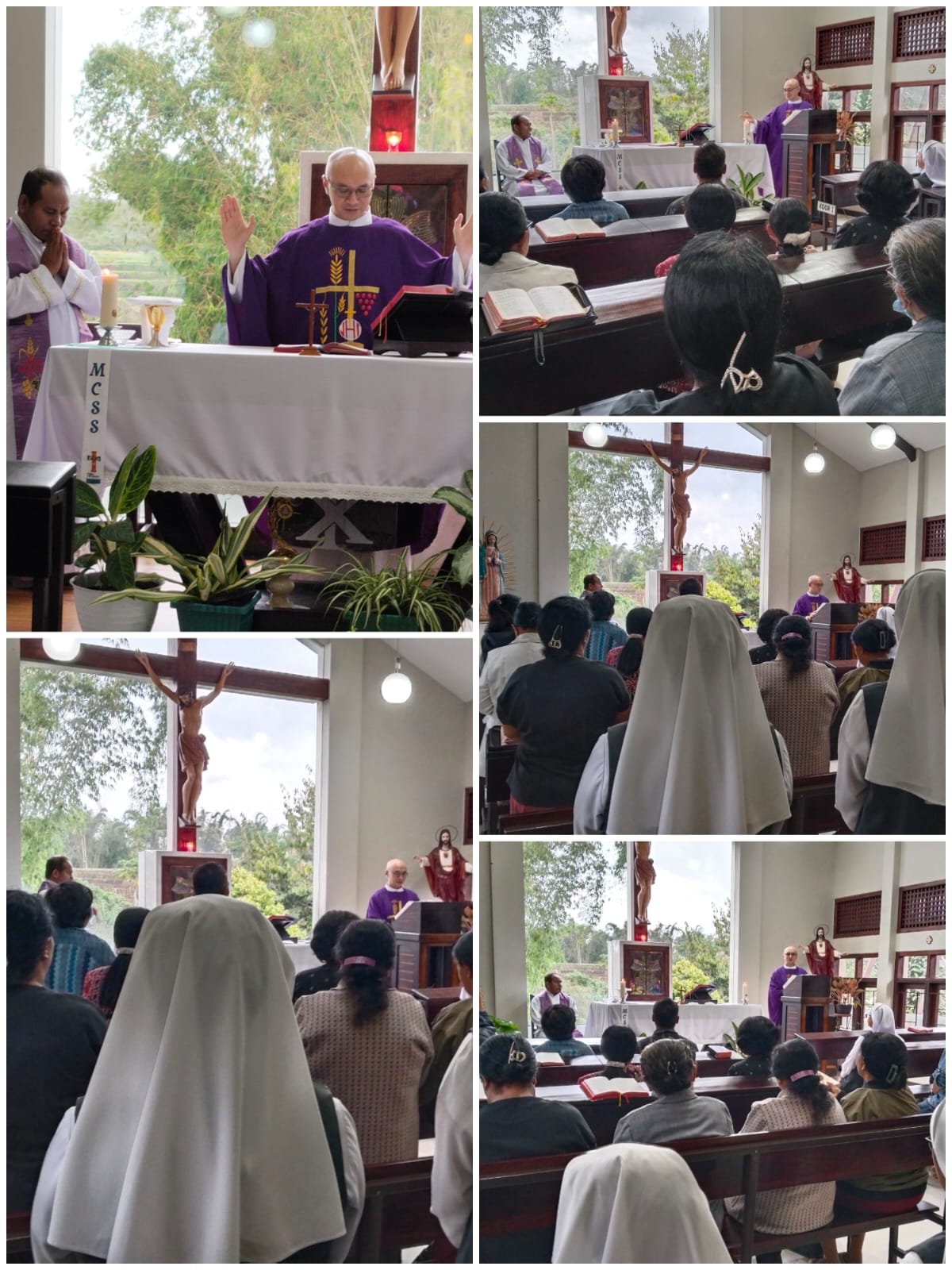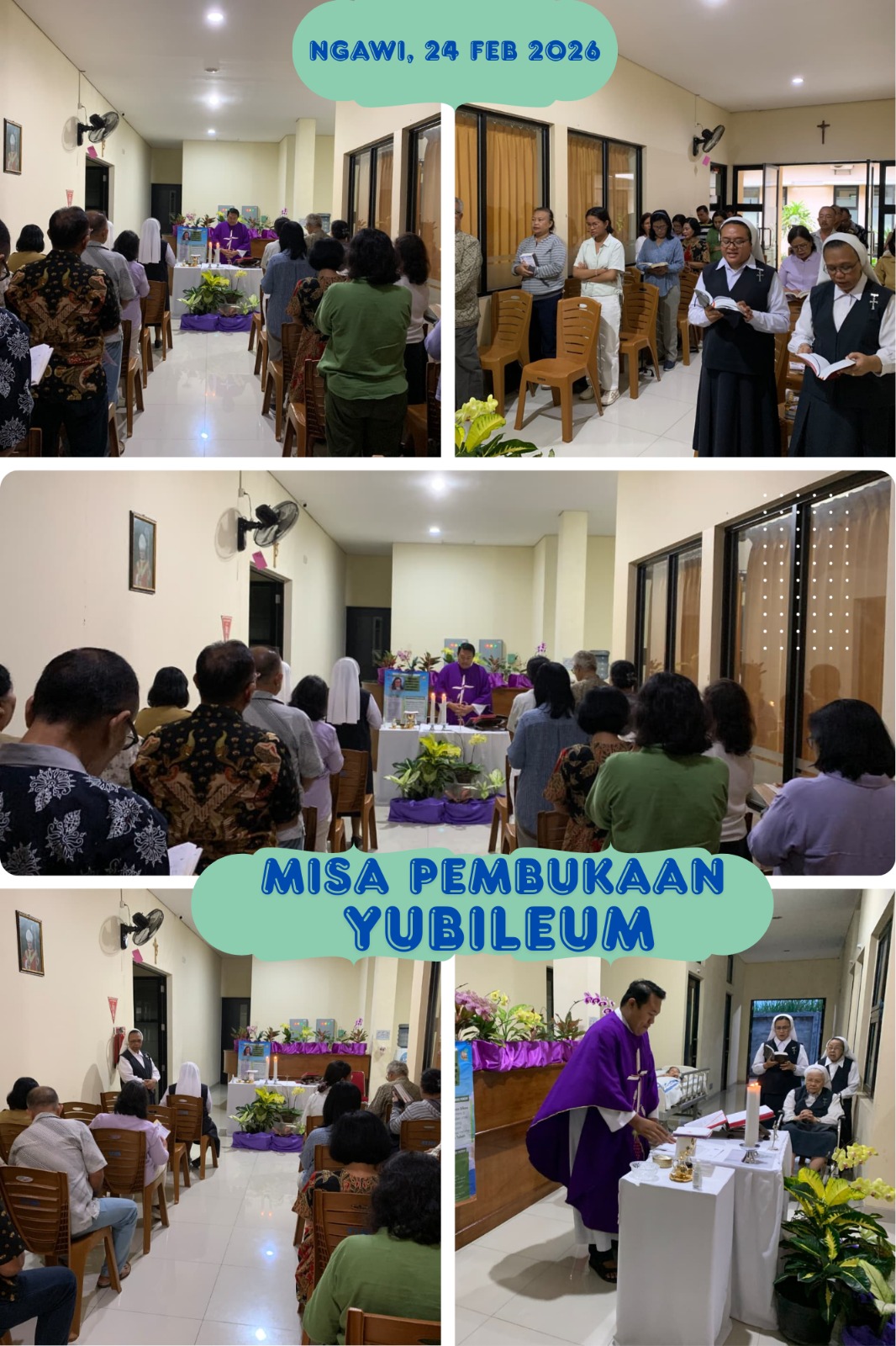 Para suster MC di komunitas Ngawi, membuka perayaan Yubileum dengan Misa Kudus di hall Klinik Pratama Santa Maria Guadalupe bersama umat dan mitra kerja. Romo Sebastianus Joko Purnomo mengatakan dalam homilinya, “Tujuan doa adalah menjalin relasi dengan Tuhan sebagai BAPA yang sangat memperhatikan setiap anak-Nya. Dalam berdoa kita harus memperhatikan, bahwa doa yang benar itu bukan untaian kata-kata indah dan puitis, bukan pula yang panjang rumusannya. Doa harus keluar dari kedalaman hati dan jiwa yang sadar bahwa dia dicintai oleh Tuhan. Dalam kaitannya dengan Tahun Yubileum yang dianugerahkan kepada Suster MC, semoga perayaan 75 tahun bukan hanya perayaan angka, tetapi kesempatan bagi kita untuk memperdalam hidup doa dan melakukan pertobatan.”
